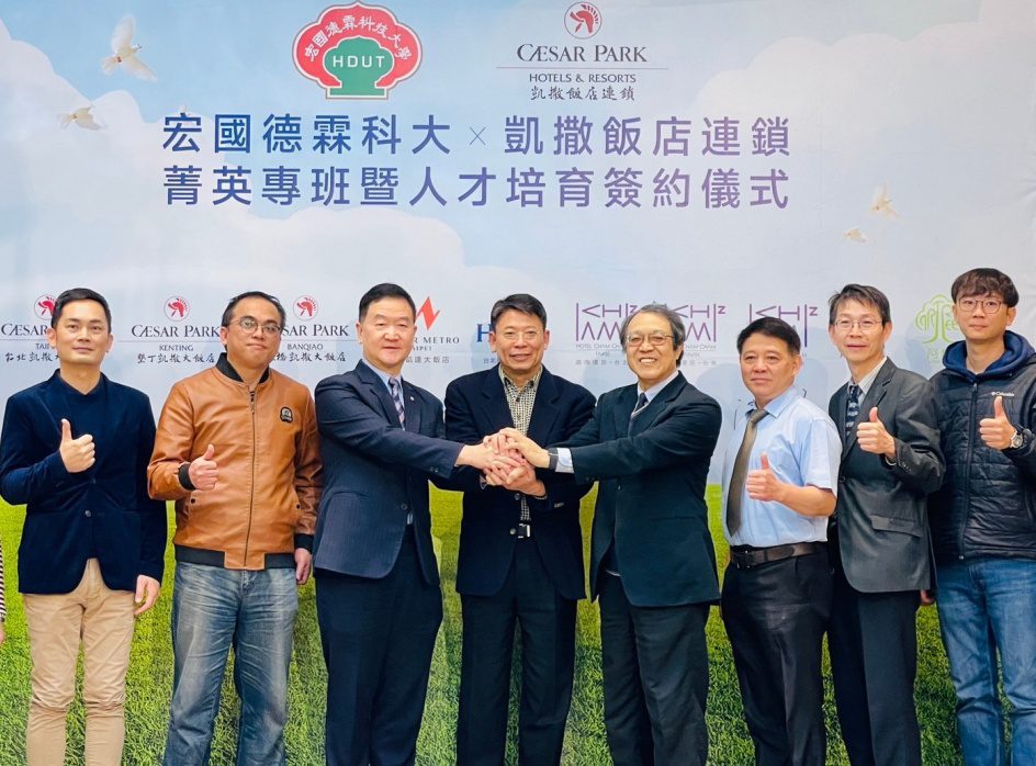 ▲宏國德霖科大羅清水校長(右)與凱撒飯店連鎖簽訂菁英專班儀式。(圖/張辰卿攝)