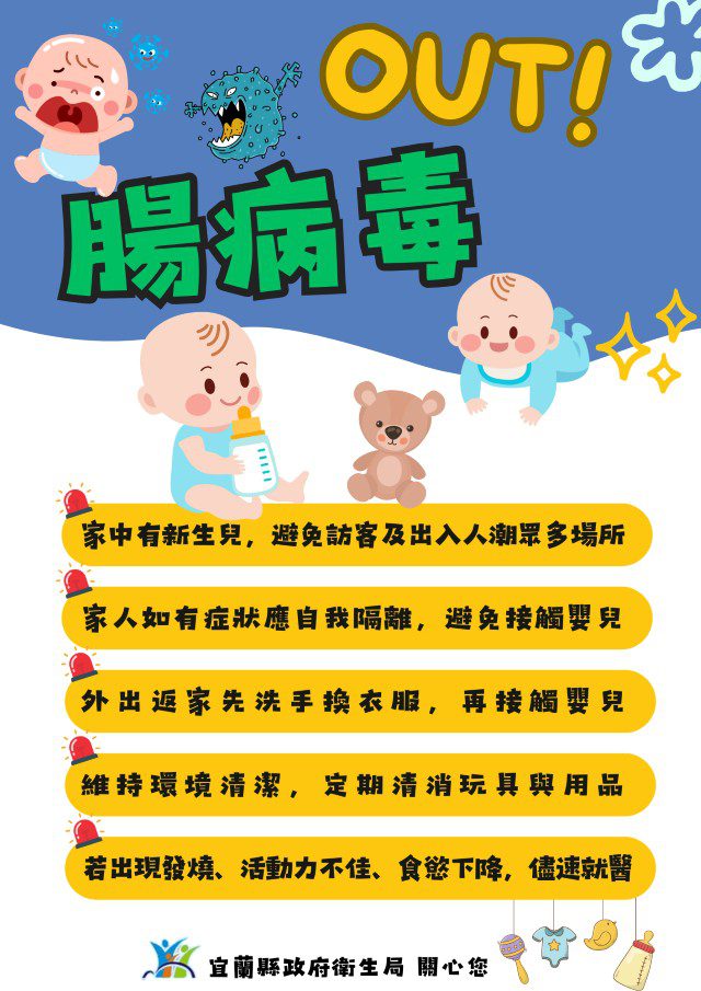 5歲以下嬰幼兒為腸病毒重症高危險群,發現有嗜睡、意識不清、活力不佳、手腳無力或麻痺、肌抽躍(無故驚嚇或突然間全身肌肉收縮)、持續嘔吐、呼吸急促或心跳加快等腸病毒重症前兆病徵時,請儘速至本縣責任醫院(國立陽明交通大學附設醫院、羅東聖母醫院及羅東博愛醫院)接受治療。