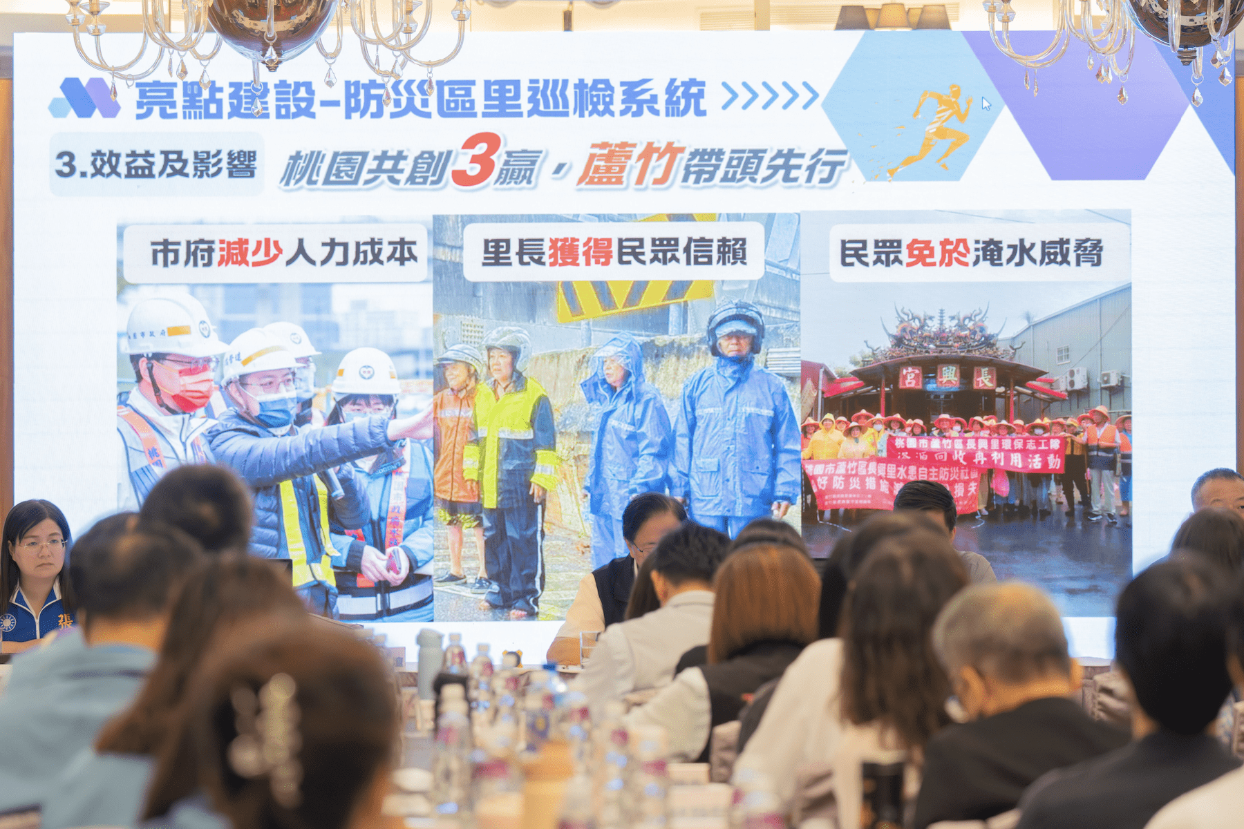 張善政提到,在市府與區公所合作下,蘆竹成功改善長期淹水問題,並以創意舉辦陸上鐵道龍舟競賽與親子活動,展現地方欣欣向榮氛圍。