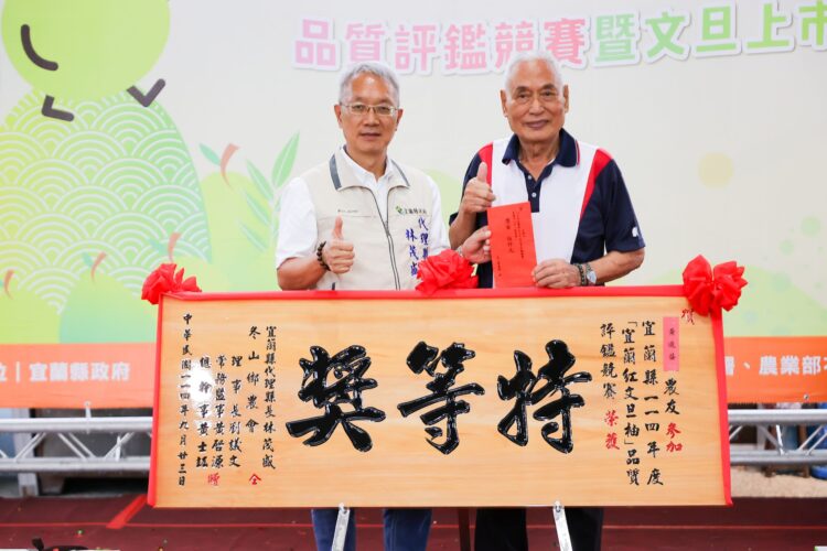 「114年度宜蘭縣紅文旦評鑑競賽暨文旦上市發表會」23日在冬山鄉農會舉行,評鑑結果、黃進益榮獲特等獎,宜蘭縣代理縣長林茂盛除恭賀獲獎農友,更盛讚宜蘭柚農技術精湛,今年氣候條件得宜,造就紅文旦品質更勝以往,呼籲大家踴躍選購,作為中秋佳節最應景的伴手禮。