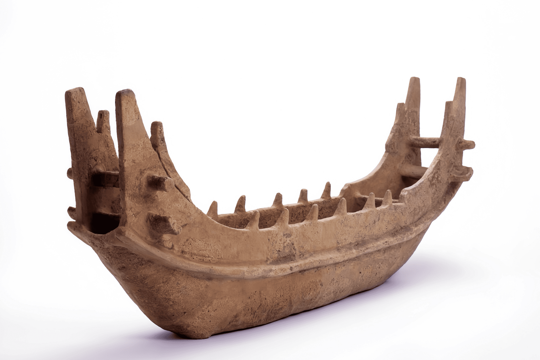 展覽中最引人注目的焦點之一,是長達1公尺的船形埴輪複製品。其原件為日本重要文化財,重現了5世紀的精湛航海技術,更被視為一艘「靈魂渡船」,承載墓主航向來世,與臺灣十三行文化中的貝器貿易形成深刻呼應,訴說著海洋文化的生死觀與交流意涵。另一件焦點文物—盤龍鏡,鏡背龍紋與「景初四年」銘文,暗藏著跨國工匠的歷史謎團,錯置的年號揭露了三國時代中日交流的鮮活證據。來自南方海域的貝鐲,以珍稀的闊唇鳳凰螺材質,則見證了日本九州權力階層如何透過物質交換鞏固地位。此外,還首次展出乳藍色玻璃珠飾、方格印紋圜底罐、圈足罐等11件十三行遺址出土文物,以及青銅刀柄、駱駝銅牌、南瓜瓣陶壺等重要古物也同時亮相,為觀眾帶來豐富的文化體驗。