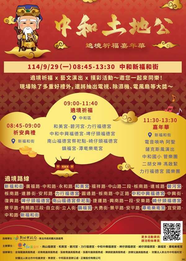 中和土地公遶境祈福嘉年華定於9月29日於中和新福和街熱鬧登場,遶境路線涵蓋多間福德宮,包括和美宮、碧河宮、力行福德宮、中和中興福德宮、埤仔頭福德宮、南山福德宮祭祀點、崎仔頭福德宮、鎮福宮及潭墘樂墘宮,歡迎大家一同參與,祈安迎福氣!活動包含莊重的祈福儀式、傳統陣頭表演、嗩吶阿聖、二胡女神馮啟絜、管弦樂及力行國樂團等精彩演出,還有福和宮、東德宮等多間宮廟限量的結緣品,現場還有互動DIY攤位及好康抽獎~包含電視、除濕機、電風扇等多項大獎,歡迎共襄盛舉。