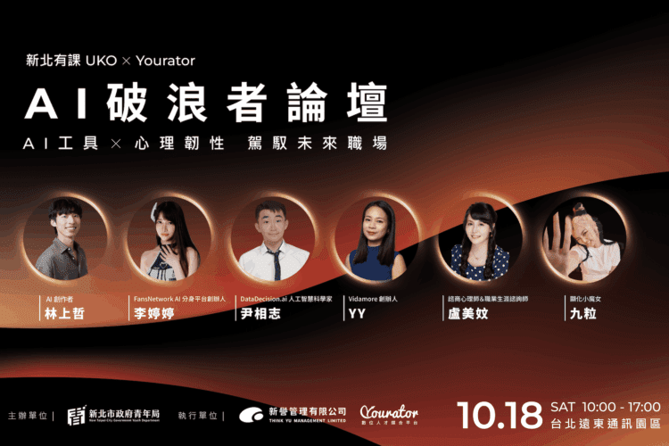 面對AI浪潮對全球職涯帶來的巨大變革,新北市政府青年局的職涯服務品牌「新北有課UKO」積極回應青年需求,將於10月18日(六)在台北遠東通訊園區B1舉辦「AI破浪者論壇︱駕馭未來職場新賽局」。本次論壇將以「技術應用×心理韌性」雙主軸,邀請來自產業實務、數位創作與心理專業領域的知名講者,分享當前進入職場的AI必備工具及AI世代下的心理韌性,協助青年全面提升職涯能力。