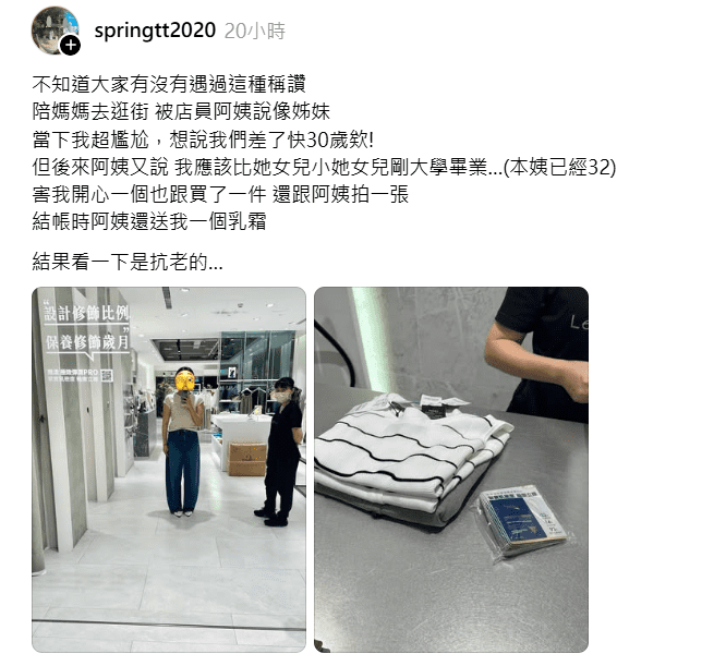 她在貼文中笑說,原本被說像姊妹的那一刻真的很尷尬,感覺是稱讚媽媽,不是她本人。但當店員又說她看起來比自己大學剛畢業的女兒還年輕時,她整個被誇到飄起來,連忙也挑了一件衣服。結果到了結帳環節,阿姨貼心送上一包乳霜當小禮物。她一看包裝寫著「抗老」,當場哭笑不得,「剛剛不是才說我看起來像大學生嗎?怎麼馬上送我抗老的?」只能佩服阿姨的話術,從頭到尾一氣呵成,前面誇到心坎裡,後面又默默提醒保養的重要性,實在太高招。