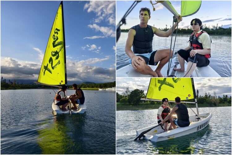 蕭煌奇聽完教練小飛說明帆船遊憩注意事項之後,脫下鞋襪、穿上救生衣,由小飛陪同共乘一艘帆船,另有救生員乘坐橡皮艇全程陪同遊湖,在平靜無風的湖面行駛近20分鐘後靠岸。