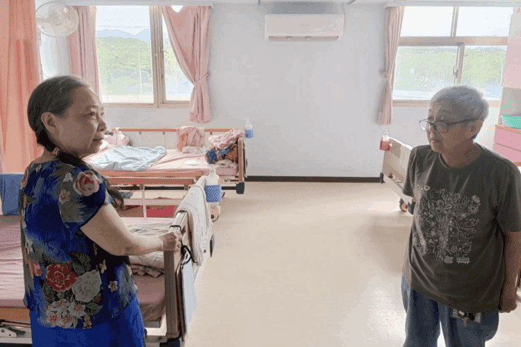 ▲小梅(右)在護理之家幫忙其他住民移位到床上。(圖/新北市社會局 提供)