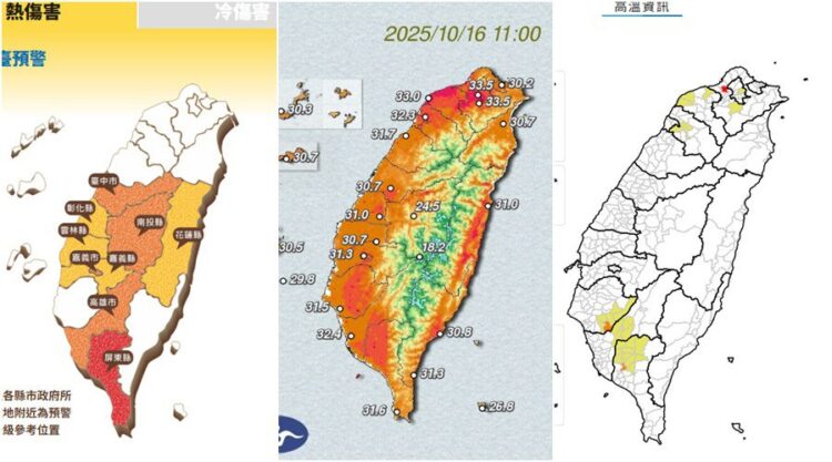 各地天氣晴朗炎熱,今天10月16日白天新北市有連續出現38度極端高溫的機率;臺南市、屏東縣有連續36度以上的機率,臺北市、桃園市、新竹縣、高雄市亦有36度以上高溫;依據熱傷害預警資料顯示,新竹縣新埔鎮、彰化縣北斗鎮、高雄市大樹區,以及屏東縣屏東市、長治鄉、萬丹鄉、鹽埔鄉,均為危險燈號。請注意防曬、多補充水份、慎防熱傷害。