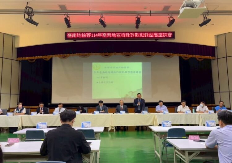 為強力打擊詐欺犯罪,台南地檢署奉台灣高等檢察署、台灣高等檢察署台南檢察分署指示,於114年10月14日下午召開「114年台南地區特殊詐欺犯罪型態座談會」,由台南地檢署鍾和憲檢察長親自主持,邀請台灣高等檢察署台南檢察分署黃玉垣檢察長、台灣高等檢察署卓俊忠檢察官蒞臨指導,法務部調查局台南市調查處高吉川處長、台南市政府警察局陳炯旭副局長、內政部移民署南區事務大隊台南市專勤隊李建雄隊長、臺南市政府地政局蔡奇昆副局長及台灣銀行台南創新園區分行陳美花經理等各單位代表蒞臨與會。