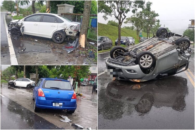 影音/疑因天雨路滑肇事 一車撞兩車後四輪朝天翻覆
