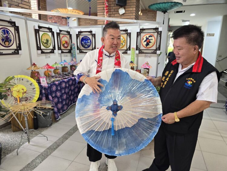 至於來自高雄的李鴻鈞,是客家文化活動的常客,他自製的美濃油傘早已名聞遠近,他將客家藍染油傘化,頗為吸睛。此次藝術傘畫,是油傘入框的自創作品,他特地拿到花蓮展售,讓客家事務處長潘乾鑑看了頻頻點頭稱讚。
