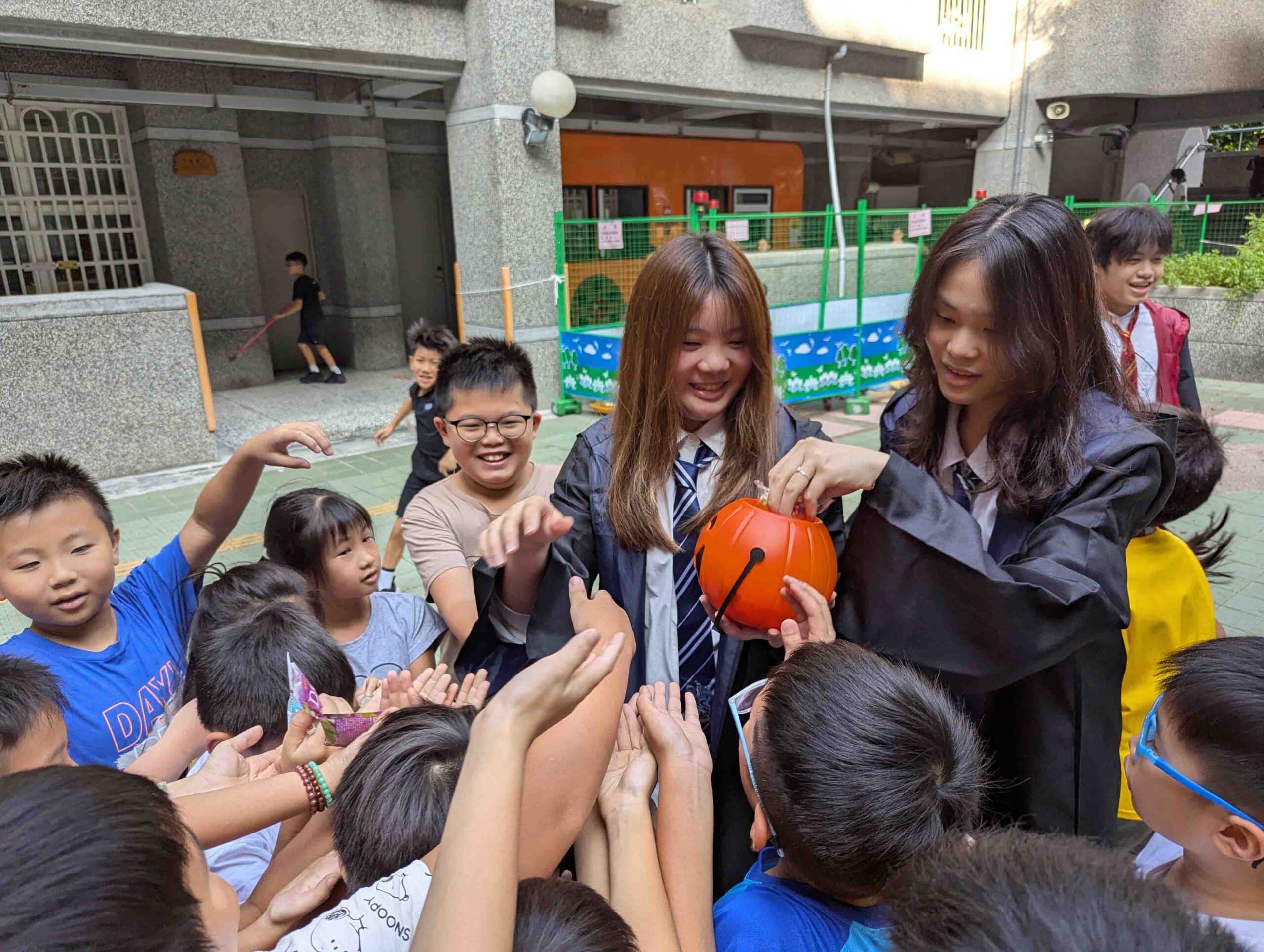 分享糖果和禮物,宜蘭縣壯圍聯合國際實驗教育機構UEIS學務主任Candace說,這樣的快閃活動,不但能讓大家更認識UEIS,也希望活動能讓大家一起感受國際萬聖節的氣氛,度過一個快樂的萬聖節。