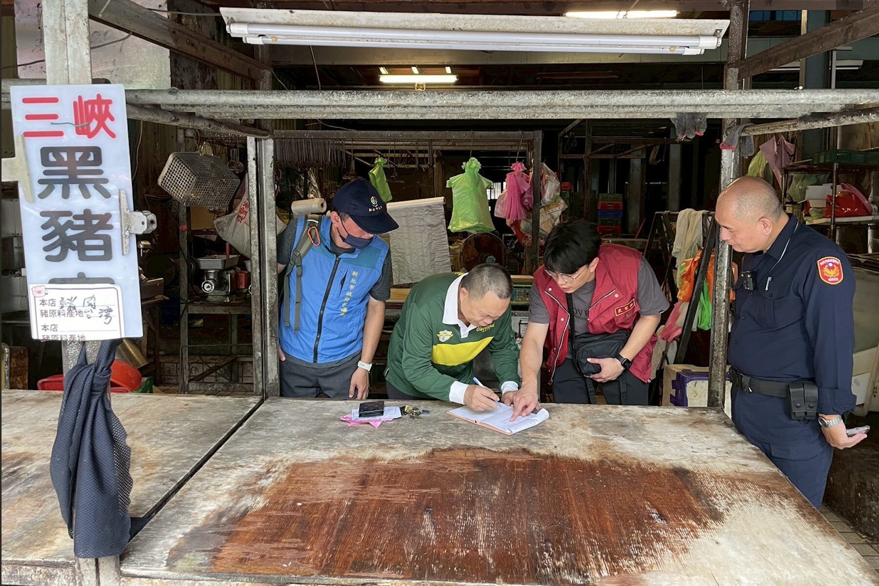 ▲豬肉攤商出示屠宰證明,確認無違規之處。(圖/新北市農業局 提供)