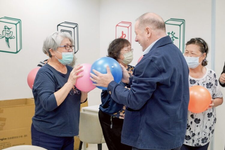 ▲Rick博士與譚孟春教授一行與「銀色知悠生-蒙特梭利中心」長輩合影。(圖/新北市社會局 提供)