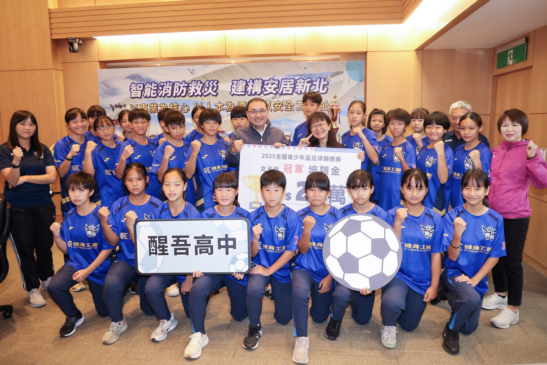 2025全國青少年盃足球錦標賽日前在臺中舉行,新北市醒吾高中國中部女子足球隊表現亮眼,奪下女子組冠軍。今(5)日於市政會議上,由隊長張羽忻代表獻上冠軍獎盃,與市民共同分享這份喜悅,市府頒發20萬元培訓金,以支持球隊持續精進。