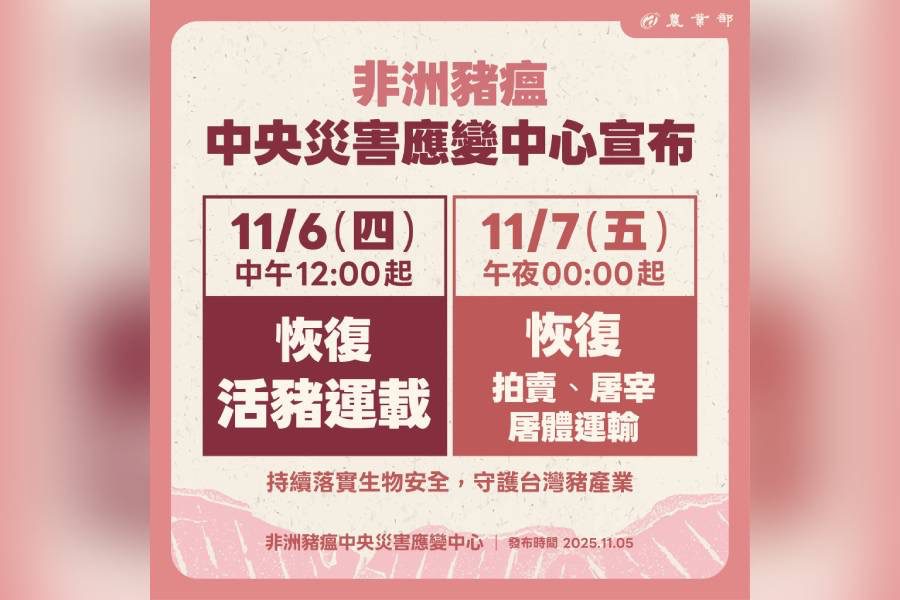 非洲豬瘟中央災害應變中心宣布,11/6(四)12:00 恢復活豬運載,11/7(五)00:00恢復拍賣、屠宰、屠體運輸。圖/農業部臉書