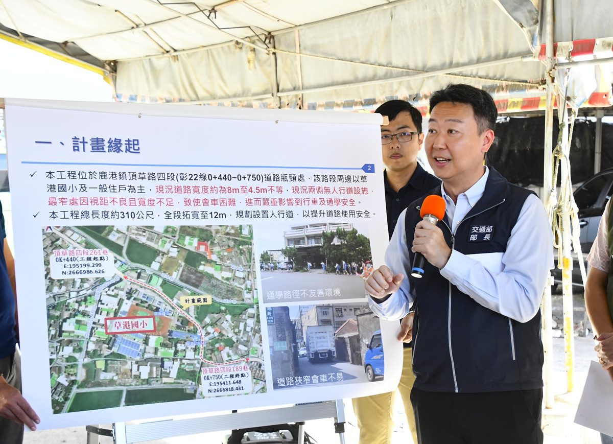 工務處表示,「鹿港鎮頂草路四段道路瓶頸處」現況兩側無人行道,視距不良且寬度不足,影響行車安全。為改善學區交通安全與道路瓶頸路段,縣府計畫將全線拓寬為12公尺標準道路,並於兩側各設置2公尺寬人行道。本案已提報「生活圈道路交通系統建設計畫(公路系統)」,公路局於今(114)年10月召開審議。建請交通部同意納入「生活圈道路交通系統建設計畫(公路系統)6年計畫(111-116)」,並補助經費7,000萬元,以改善區域交通。