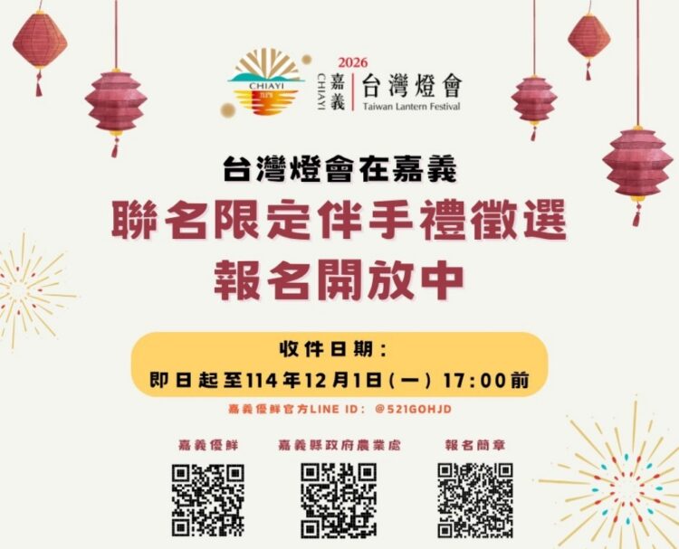 此活動報名期間自即日起至114年12月1日止,預計選出10項「嘉義優鮮 × 2026台灣燈會」聯名限定伴手禮,並於燈會期間正式展售,讓海內外遊客能「看燈會、買好禮」,將嘉義獨特的美味帶回家。