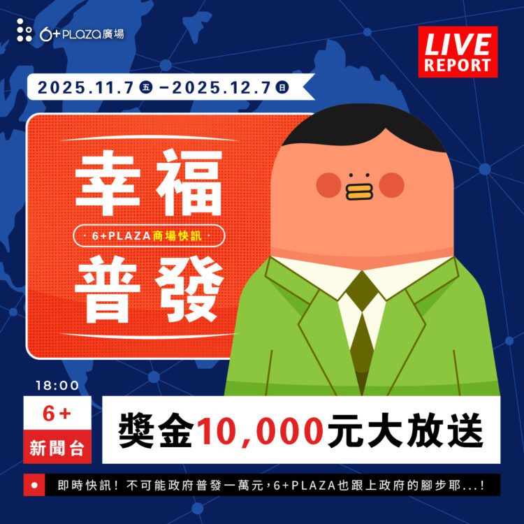 活動期間自11月7日至12月7日,6+PLAZA將抽出50位幸運顧客贈送200元購物金,凡於館內專櫃單筆消費滿1,000元,並至粉絲專頁填寫指定表單登入發票,即可參加抽獎,每筆消費皆有機會中獎!官方也在社群上以一句話炒熱話題:「政府發一萬,我們也發!」引發網友熱烈轉傳,直呼「這個活動太接地氣了!」、「超有創意!我也要領購物金」