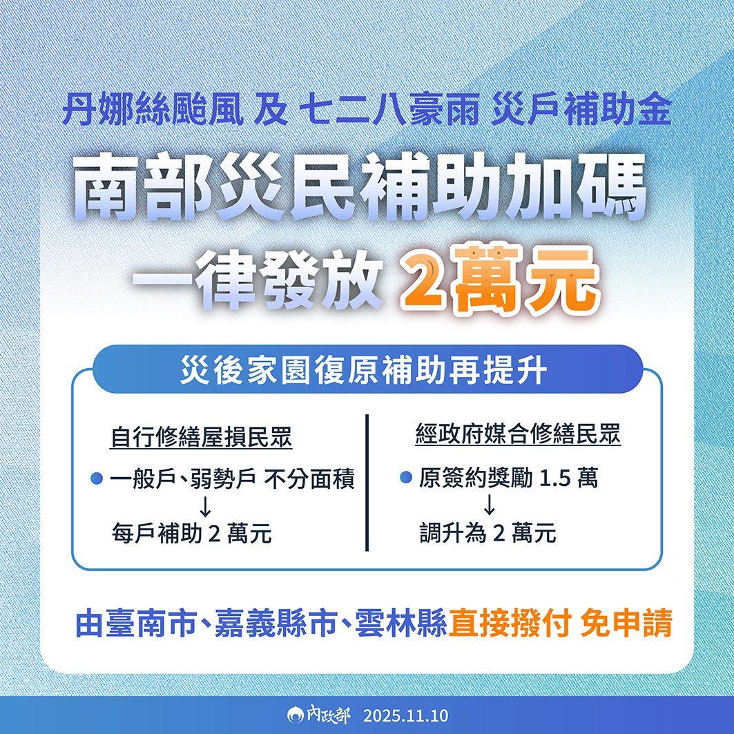 今年7月丹娜絲颱風及連續豪雨,造成嘉義縣高達1萬5千多戶受災戶家園受到嚴重損害,為加速受災戶重整家園、減輕其經濟負擔,行政院已於11月6日核定修正「丹娜絲風災家園復原民宅修繕、災屋拆除及媒合補助金專案」,雲林縣、嘉義縣市及臺南市資格受災戶補助加碼,一律發放2萬元補助金。