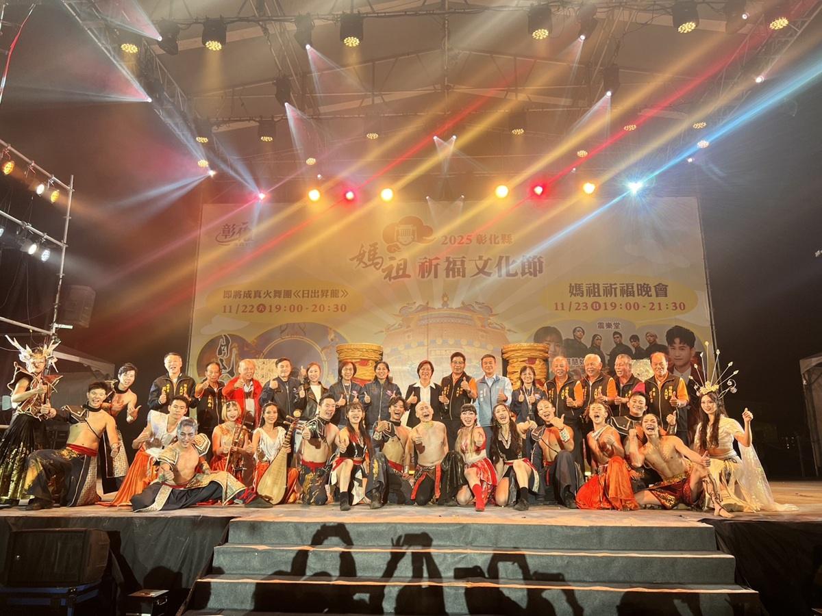 「2025彰化縣媽祖祈福文化節」第二天演出活動,於(22)日晚間在社頭枋橋頭天門宮停車場熱鬧登場,由國際級火舞表演團隊「即將成真火舞團」帶來跨界鉅作《日出‧昇龍》演出,融合火舞、舞蹈、馬戲、高空特技、國樂與火焰裝置藝術等多重元素,並結合沈浸式互動設計,讓觀眾宛如置身神話與遊戲交織的奇幻世界,現場人潮爆滿、氣氛熱烈,縣長王惠美、天門宮主委劉清尊等人親臨現場欣賞表演,並和民眾一同感受火焰的力量與信仰的溫度,共度熱情洋溢的夜晚。