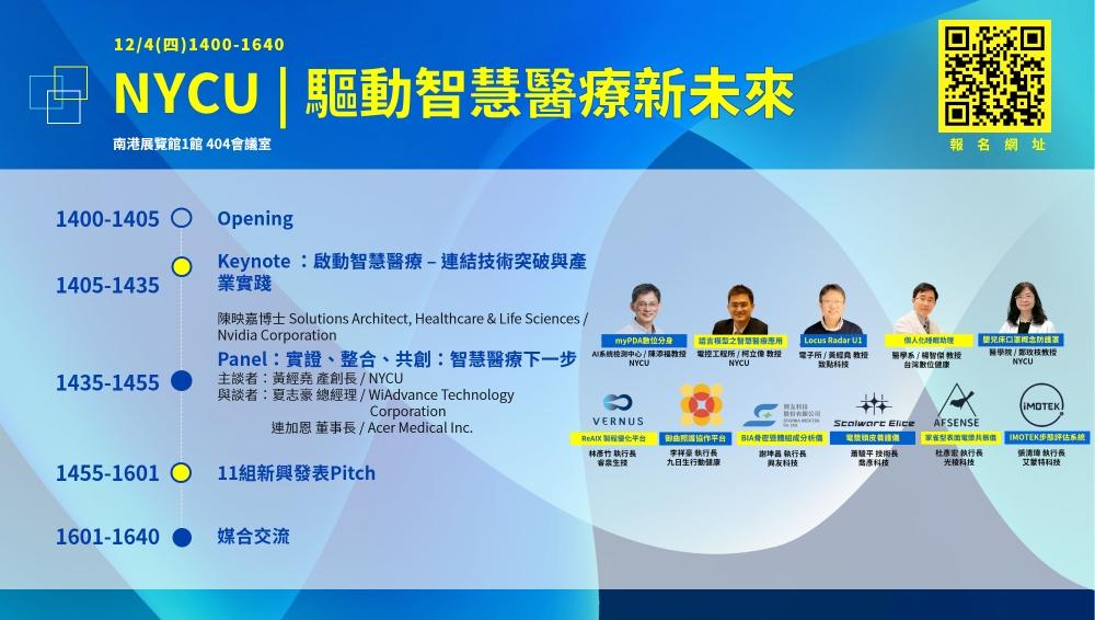 除主題館外,陽明交大亦將於 12 月 4 日舉辦「NYCU|驅動智慧醫療新未來」發表活動,從產業趨勢、臨床需求到醫院應用,探討智慧醫療的技術突破與落地挑戰。論壇由 NVIDIA Corporation Solutions Architect, Healthcare & Life Sciences 陳映嘉博士進行「啟動智慧醫療-連結技術突破及產業實踐」專題分享;活動中並同步安排跨領域座談,由陽明交大、緯謙科技及相關合作單位,針對智慧醫療之產業推動及健康照護整合等面向進行交流;同場舉行十一組新創暨新興技術 Pitch發表,展現智慧檢測、感測、生醫材料、智慧醫材與健康管理等多元創新成果,促進醫療院所、企業與新創的媒合合作,加速技術落地。