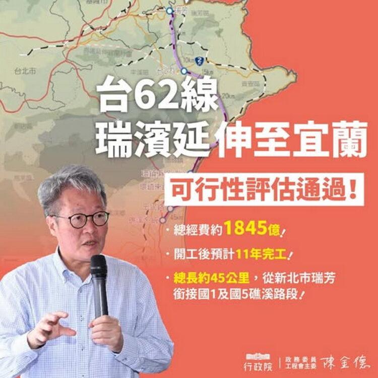 攸關宜蘭發展的重大交通建設再度傳出好消息!行政院政務委員兼公共工程委員會主任委員陳金德今天25日中午在臉書發布:行政院已經正式核定台62線瑞濱延伸至宜蘭的可行性評估!他並強調:會持續督促進度,與各部會協力,讓這項關鍵工程能早日開工、如期完工,為宜蘭帶來真正的交通改善。