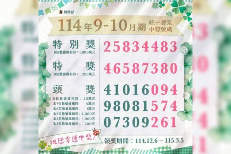 𝟭𝟭𝟰年𝟵-𝟭𝟬月期統一發票獎號。圖/財政部臉書