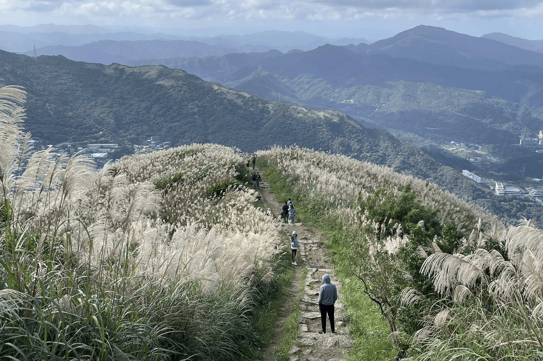 想捕捉最經典的芒花美景,絕不能錯過瑞芳通往雙溪的102縣道上的不厭亭。這座知名觀景台是芒花攝影的朝聖點,每年吸引許多遊客前往拍照。冬季山頭從翠綠轉為銀白,芒花在光影下輕輕搖曳,搭配蜿蜒的山路與層層山巒,宛如一幅動態芒花畫作。不厭亭停車便利,也很適合作為家庭自駕遊的中繼休憩點,輕鬆欣賞最具代表性的山城景色。若想輕鬆無負擔地賞芒,報時山步道更是不容錯過。全長僅166公尺,步行約10分鐘即可抵達觀景台,沿途芒花隨風飛舞,是小朋友也能輕鬆完成的親子路線。觀景台上可360度飽覽水湳洞、陰陽海、基隆山等東北角經典景點,風景遼闊震撼。步道入口位於勸濟堂停車場旁,交通便利、停車方便,無論親子或銀髮族都能輕鬆漫遊。