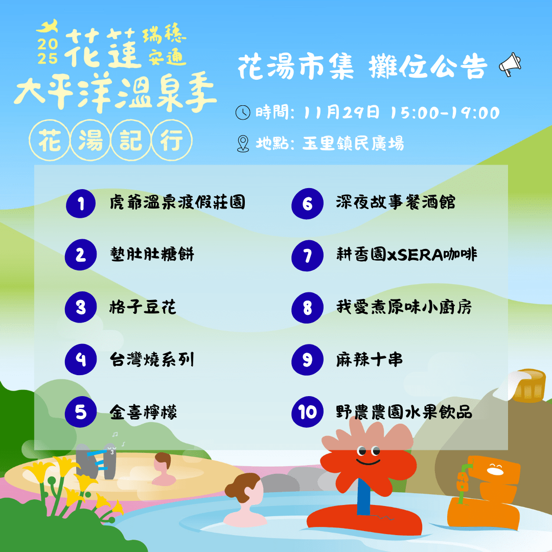 2025花蓮太平洋溫泉季持續點亮縱谷冬季旅遊,本週六(11/29)晚間6點起將在玉里鎮民廣場推出「花湯市集x湯畔音樂會」,匯集在地風味、美好夜色與人氣卡司,邀請旅人逛市集、聽音樂、泡好湯,享受屬於花蓮冬季最療癒的「夜間三部曲」。