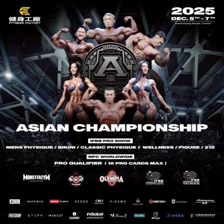 2025年亞洲最受矚目的指標性健美賽事— 《IFBB PRO/NPC WORLDWIDE 亞洲健美錦標賽》(Asian Championship)將於12月5日至7日隆重登場,首次在台灣舉辦,以亞洲最大規模、最強陣容之姿,寫下台灣健美史全新里程碑。其中亞洲健美錦標賽由韓國 Monsterzym、IFBB PRO League Taiwan 與健身工廠Fitness Factory共同主辦,並由IFBB PRO LEAGUE直接授權,是亞洲等級最高、選手最重視的官方殿堂級賽事。2025賽事亦是亞錦賽第二度於亞洲舉行,更是首次進軍台灣,意義非凡。此次賽事亮點,包括職業賽包含212 Bodybuilding、Classic Physique、Men’s Physique、Bikini、Women’s Physique,以及台灣首次舉辦職業組Wellness這6大項目,而業餘賽則是包含傳統健美、古典健美、健體、比基尼、女子形體、健康體態、健身模特兒、女子形體8大項目,本屆將頒發最多16張職業卡(業餘組每項目最多2張),吸引超過20國、逾120位以上精英選手參戰,為亞錦賽歷年規模最大的一屆。