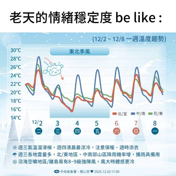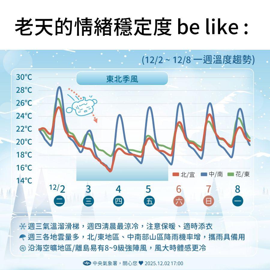 氣溫方面,中部以北及東北部、東部明顯轉涼,北臺灣高溫約在20、21度,整日感受涼冷,中部及花東高溫約22至24度,南部高溫可達27度左右,中南部日夜較大,入夜後各地溫度會進一步下降,西半部及東北部低溫約14至16度,花、東低溫約18度,局部沿海空曠地區及近山區平地氣溫會再更低一些,外出請適時增添衣物以免著涼。