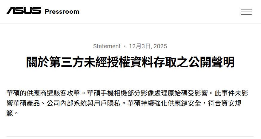 華碩緊急澄清:華碩的供應商遭駭客攻擊。華碩手機相機部分影像處理原始碼受影響。此事件未影響華碩產品、公司內部系統與用戶隱私。華碩持續強化供應鏈安全,符合資安規範。