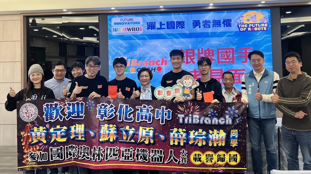 彰化之光閃耀世界舞台!彰化高中數理資優班學生黃定理、薛琮瀚、蘇立原,於11月24日代表臺灣前往新加坡參加2025年國際奧林匹亞機器人大賽總決賽,憑藉卓越的創新思維與技術實力,從眾多國際好手中脫穎而出,一舉勇奪銀牌,為臺灣與彰化寫下榮耀的新篇章。彰化縣長王惠美特於4日親赴學校頒贈紅榜與獎金,盛讚三位同學是彰化之光,也是臺灣之光!同時也感謝王延煌校長、指導老師的辛勤付出,以及家長會長張威創與家長會的鼎力支持,有學校、家長會做為師生們最堅強的後盾,積極提升軟硬體設備、支持多元課程發展,才能讓彰化的孩子們無後顧之憂地在國內外舞台上發光發熱。