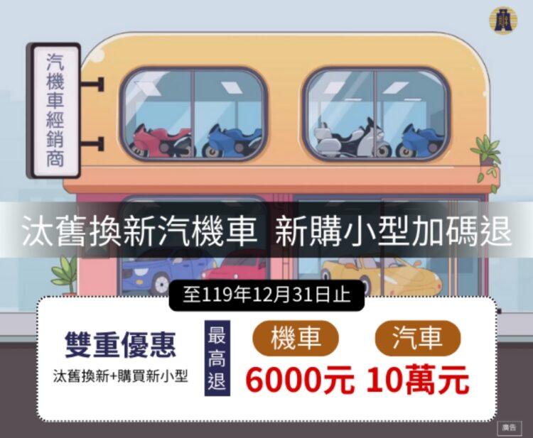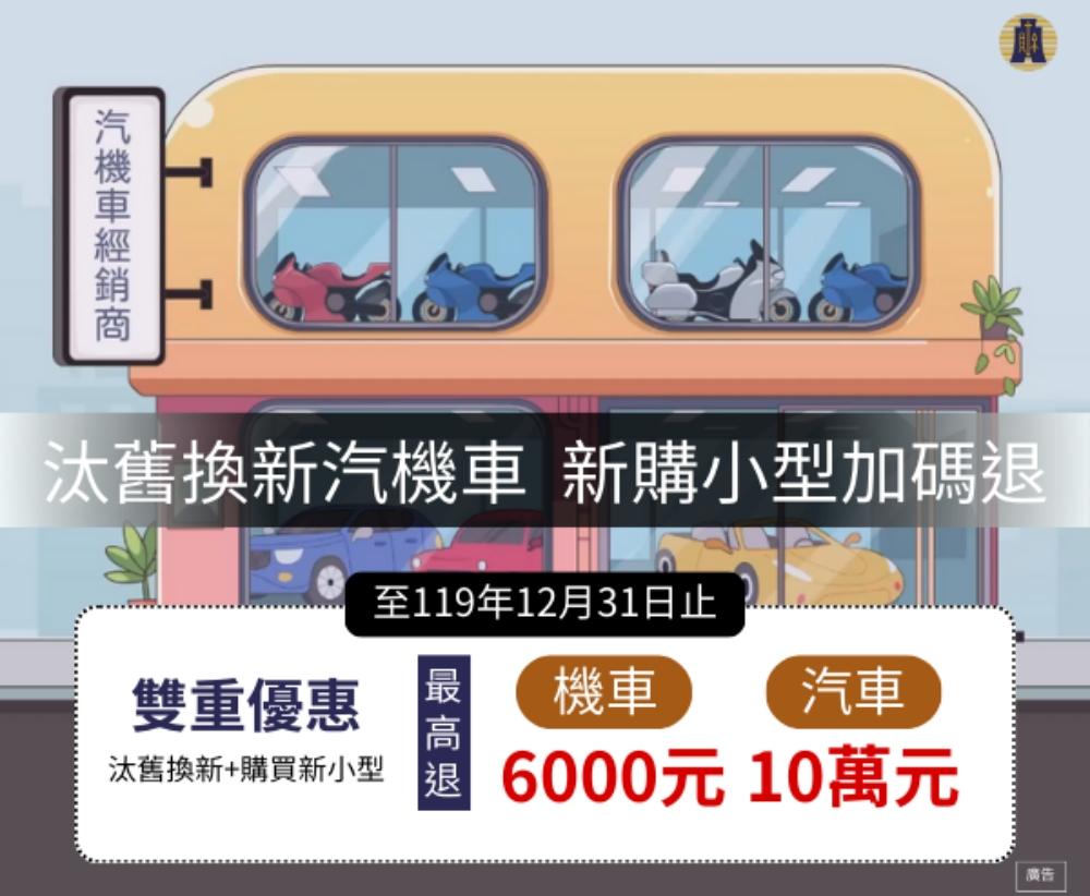 財政部臺北國稅局表示,自114年9月7日起至119年12月31日,購買新小型小客車及新小型機車,同時報廢舊汽機車者,最高可享退還貨物稅新臺幣(下同)100,000元優惠。