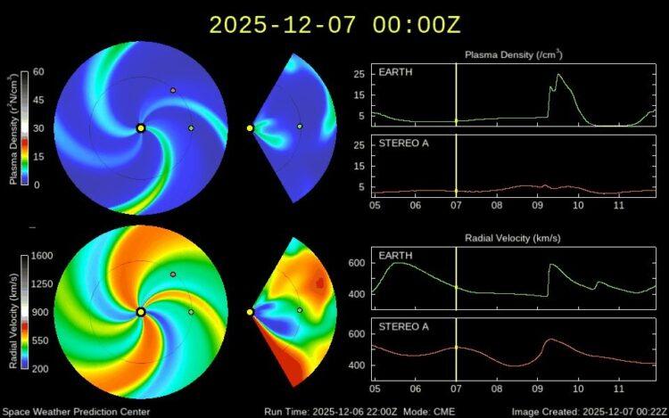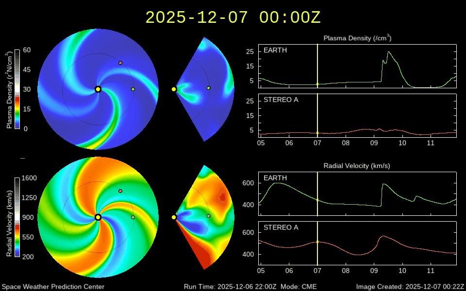 氣象署說明,受到太陽表面活躍區(AR4299)於12月7日發生顯著的日冕物質拋射事件(CME),預期於12月9日清晨通過近地太空環境,造成行星際空間中的太陽風風速及密度明顯增加,依據NOAA WSA-Enlil模式資料分析,預估地磁擾動將有明顯增強並持續影響約39小時,最大規模可能短暫達到中度磁暴等級(Kp=7, G3)。