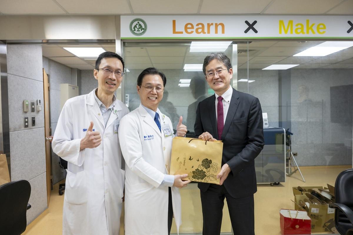 ▲Ihara 教授(右)至彰基中風病房,由林志明主任說明彰基對腦血管疾病患者的照護。(圖/彰基提供)
