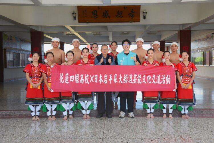 ▲花蓮市長魏嘉彥(右二)和四維高中校長蔡忠和(右一)分別鼓勵原舞社同學,透過舞蹈成為文化交流的橋梁。