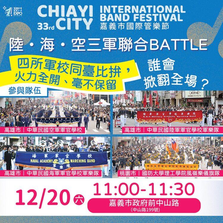 「2025嘉義市國際管樂節」特別推出全新亮點企劃「陸・海・空三軍聯合BATTLE」快閃演出,12月20日上午11時在嘉義市政府前中山路震撼登場,集結四所軍校同臺較勁,以磅礡氣勢掀起歲末最熱血的街頭盛景。