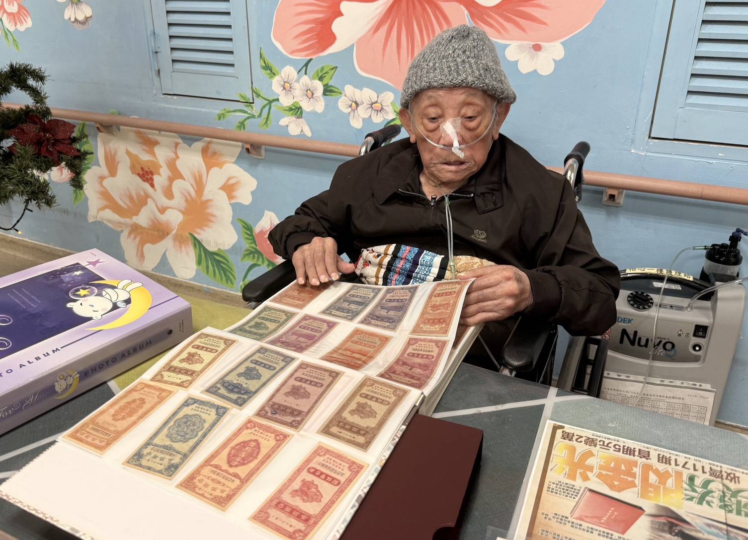 ▲花蓮榮家主任游文勇(右一)與雷年坤伯伯(右二)一起翻開愛國獎券、舊台幣與糧票,回憶往日情懷。(圖/花蓮榮家提供,下同)