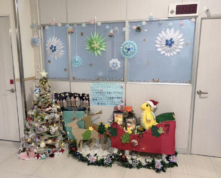 此次耶誕佈置最大特色,在於全數作品皆由院內醫護人員利用回收紙板與再生素材親手製作。立體雪花、薑餅人、耶誕馬車等裝飾,在護理人員忙碌的醫療工作之餘,一點一滴完成,不僅展現巧思與創意,更傳遞出對病患細膩而真摯的關懷。原本看似冰冷的純白空間,經由手作溫度的注入,化身為象徵希望與祝福的節慶場域。