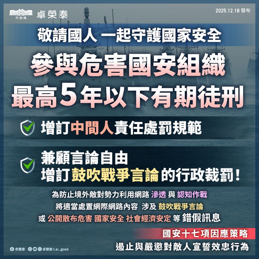 為遏止境外敵對勢力對國家主權及安全威脅,行政院會今(18)日通過「國家安全法」等部分條文修正草案,行政院長卓榮泰指出,鑑於境外敵對勢力滲透手法多元且多變,除在我國發展組織,更透過各種途徑拉攏、吸收國人參與,伺機刺探、竊取機密,危害國家安全,因此本次修法增訂參與組織的不法樣態及中間人責任的處罰規範,並加重處罰現役軍人、公務員故意犯「國家安全法」之罪,以及現役軍人與退除役官兵違反忠誠義務的行為,並擴大喪失請領退休(職、伍)給與權利的適用範圍。