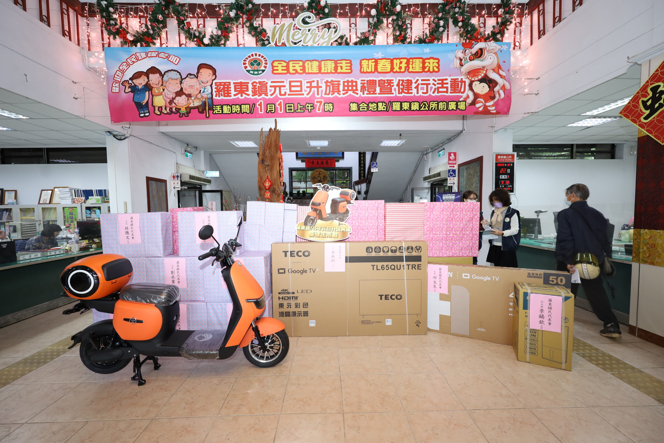 健走活動準備多項精美獎品,包括微型電動二輪車、65吋與50吋液晶電視、6公升除濕機、16吋立扇、腳踏車等,獎品豐富。