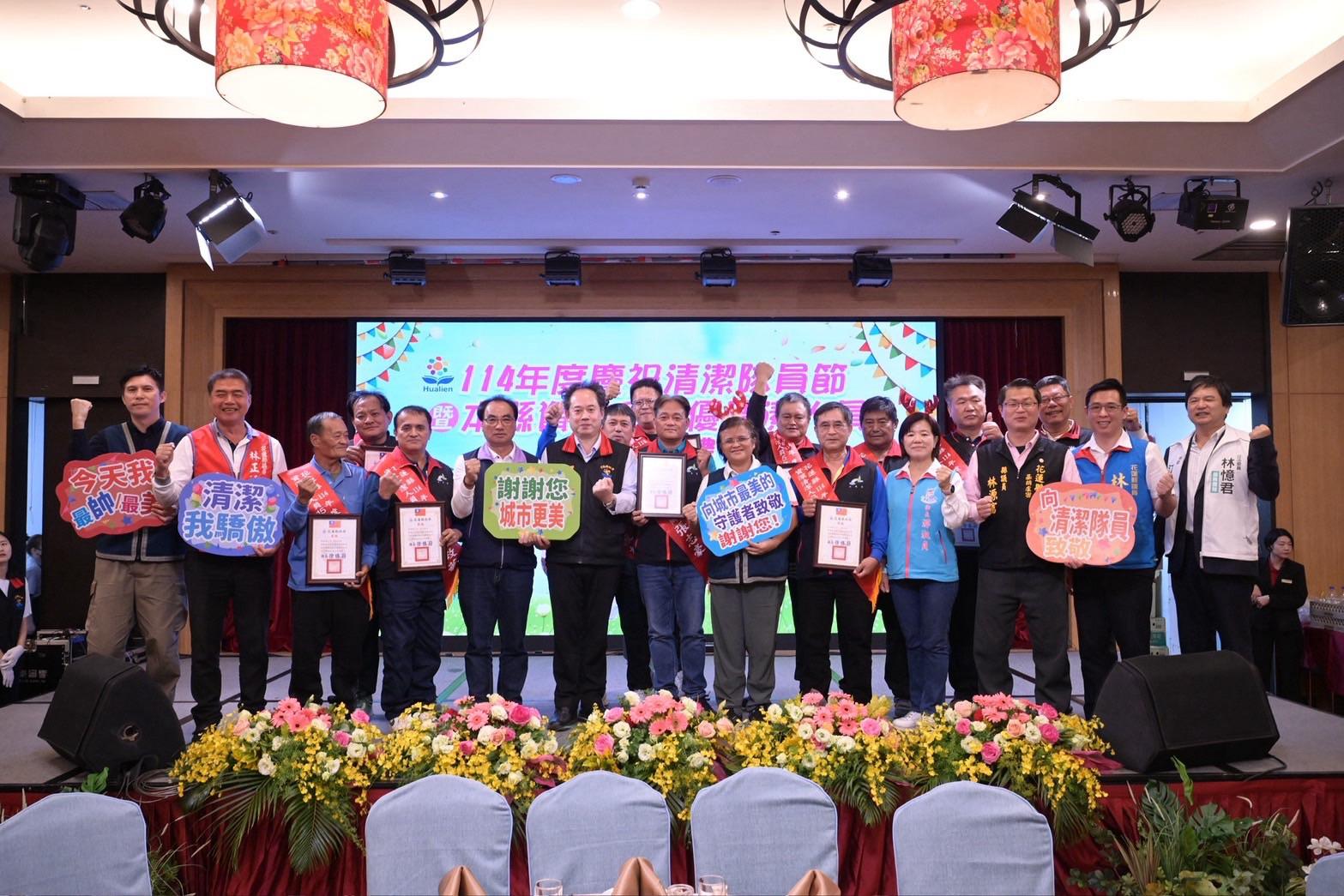 花蓮縣政府今(24)日在福容大飯店舉辦「慶祝清潔隊員節暨本縣資深及績優清潔人員表揚典禮」,縣長徐榛蔚頒獎時,感謝清潔人員長年無私奉獻,600餘名清潔隊員齊聚一堂,座無虛席。