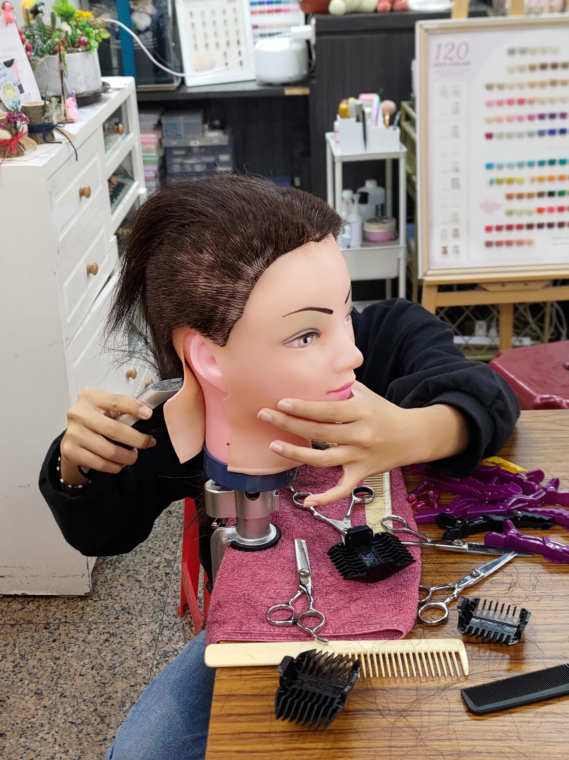 最後,學員實際進行假人頭平剪練習,從分區、定位到剪裁逐步操作,在講師即時指導與修正下,學習手感控制與線條整齊度,理解基礎剪髮技術對後續造型變化的影響。