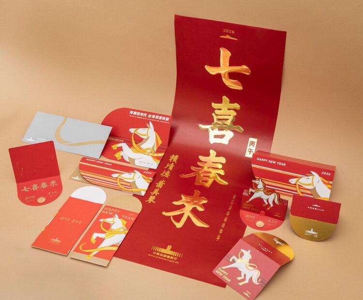 發言人郭雅慧進一步說明,春聯賀詞「七喜春來」,其中數字「七」亦代表完美與幸運;「七喜」指平安、健康、豐裕、幸福、成功、愛情、和樂。「春來」則指新春到來,代表著美好佳節、春來日暖、內心喜悅、生機蓬勃的意涵。而春聯設計賀詞旁的「丙午」二字,在字形設計上,巧妙融入馬頭剪影的視覺意象,並搭配賀詞上面的玉山剪影作為視覺起點,以臺灣最高峰玉山象徵國家精神的高度與人民共同仰望的方向。