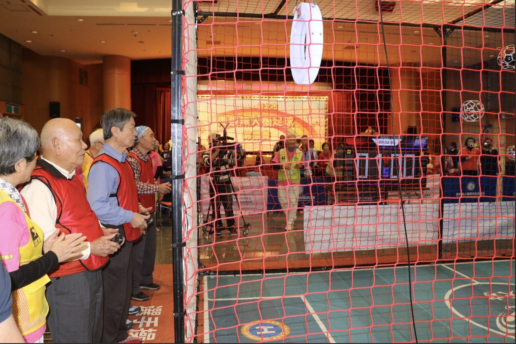 新北市首屆「銀髮x青年共創未來」無人機足球種子教練培訓成果展,現場共有 14 組由銀髮長輩與青年志工組成的聯隊同場競技,展現「活到老、玩到老、學到老」的共融精神。
