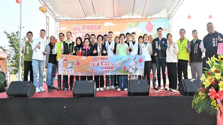 芬園鄉農會舉辦「2026芬響農食典白寶玉出土記」,今日在芬園鄉寶藏寺盛大登場,縣長王惠美應邀與會,現場近5、6千名鄉親共襄盛舉。今年活動以農會品牌 Logo「芬饗」為核心,結合深受民眾喜愛的「拔蘿蔔」體驗活動,傳達「從產地到餐桌,真誠饗宴」的理念,讓民眾親身走進農村、體驗農事樂趣。