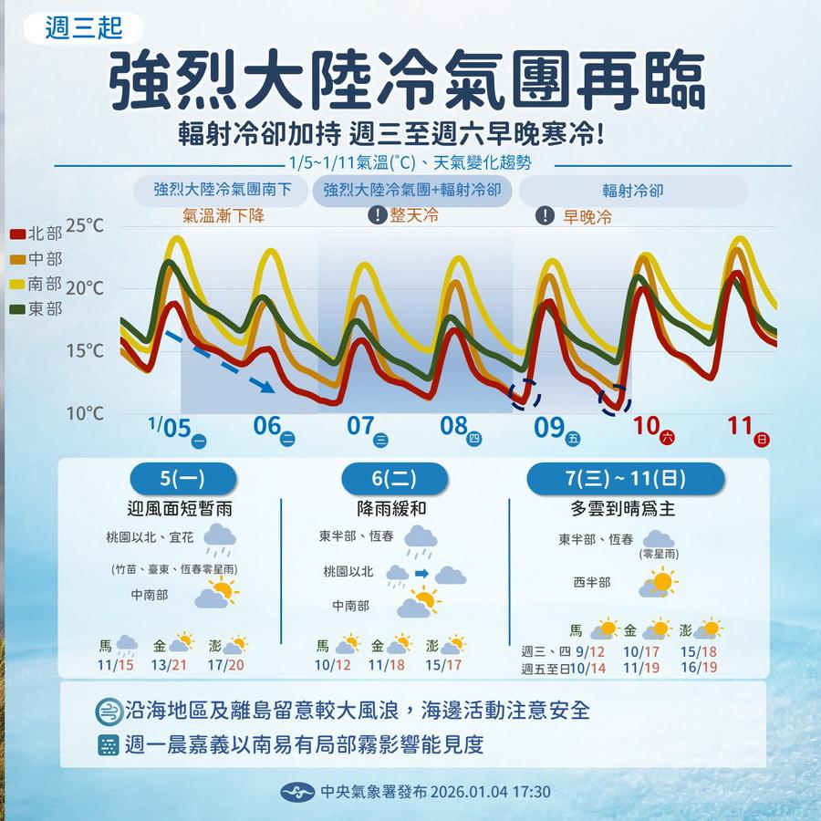 今天1月5日週一,強烈大陸冷氣團再度來襲,氣溫逐漸下降,氣象署預報,週一開始氣溫逐漸下降,週三、週四會整天冷,週三起轉為乾冷,週三至週六因輻射冷卻影響,早晚會特別冷。請注意保暖,農作物及水產養殖業慎防寒害。