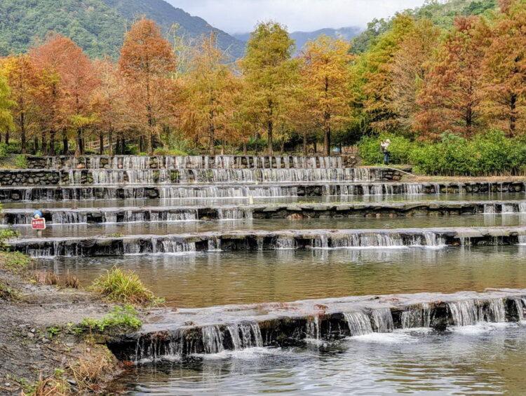 階梯式的三層坪農塘,順著山勢建構出層層遞進的水塘與瀑布,堪稱全台首創,長達百米的「九層疊瀑」,水流緩緩傾瀉而下,節奏分明的盡情流淌,潺潺水流、蟲鳴鳥叫,在山林地景間共成天籟般的交響曲。