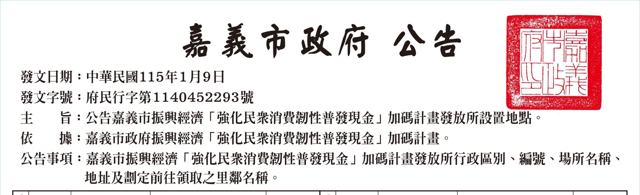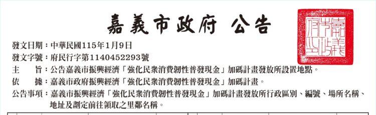 為持續推動地方經濟振興、強化民眾消費韌性,嘉義市政府辦理「振興經濟-強化民眾消費韌性普發現金加碼計畫」,並訂於115年1月24日(星期六)及1月25日(星期日)兩日進行現金發放作業。